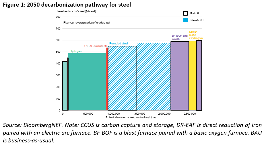 By 2050, green hydrogen could be the cheapest production method for steel and capture 31 per cent of the market. Another 45 per cent could come from recycled material, and the rest from a combination of older, coal-fired plants fitted with carbon capture systems and innovative processes using electricity to refine iron ore into iron and steel. This would be a dramatic shift in the type of furnaces and fuels used to produce steel. Today, around 70 per cent of steel is made in coal-fired blast furnaces, with 25 per cent produced from scrap in electric furnaces and 5 per cent made in a newer, typically natural gas-fired process known as DRI, or direct reduced iron. Converting a significant portion of the fleet to hydrogen would require more DRI plants and more electric furnaces. Blast furnace production would fall to 18 per cent of capacity in this scenario.Government and corporate net-zero commitments are pushing the steel industry to cancel out its emissions by 2050. Efforts to decarbonize steel production are central to the net-zero aspirations of China, Japan, Korea and the European Union. The report ‘Decarbonizing Steel: A Net-Zero Pathway’, which was launched in time for the virtual BNEF Summit Shanghai, outlines the path to making profitable, low-emissions steel and describes how a combination of falling hydrogen costs, cheap clean power and increased recycling could reduce emissions to net zero, even while total output increases.